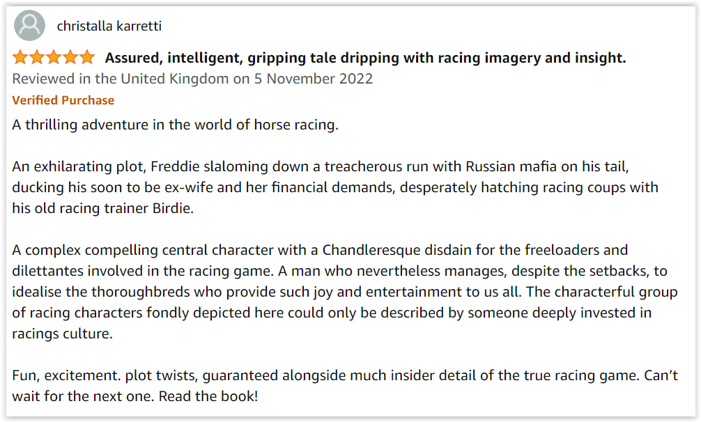 Places Reversed is a rollercoaster of suspense, intrigue, and counter-intrigue, all unfolding against the backdrop of some very lush setting (the Royal Ascot chapters are fantastic, for example). The reversals are epic, as is the climax – just as all the antagonist and rival forces established throughout the narrative move towards inevitable collision with Freddie, the debt collectors and the French Police being the last straw. How he gets out of this is glorious! It really is a masterclass in how to plot a thriller, especially a racing thriller. The final win is brilliantly handled after another notional defeat and a lot of crafty hints and misdirection. I figured out it was something to do with Robert and the saddles, but his near ‘heart attack’ act temporarily threw me which is exactly what it needed to do. The sound of the alarm signalling a steward’s enquiry is perfect. And after this, the Felix story is tied up in the final chapter, effectively turning the denouement into another climax before the true denouement when David returns (having been presumed to have done a runner), with all the booty. Great stuff. Recommended.