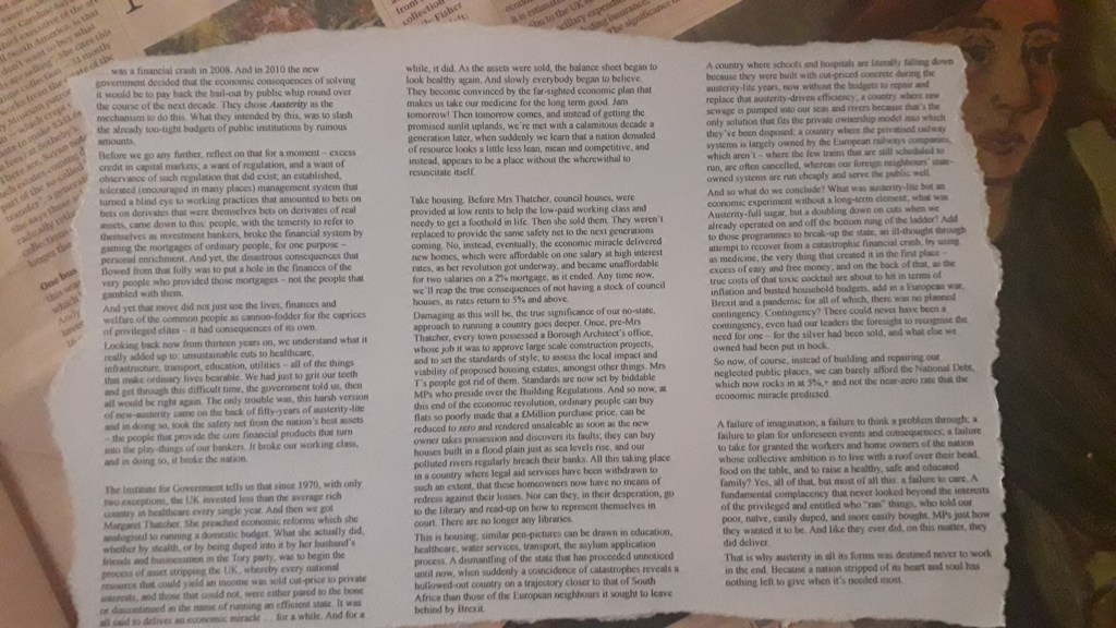 That article is the first in a trilogy, through which we are to unveil our radical centrist views: to have the crucial institutions of state run on an evolving thirty-year plan. The first in the series establishes the idea of the UK as a state hollowed-out by ruinous cuts to public spending over the last fifty years or so. It reinforces one of the key planks of our message: that to run a country on less than the bare minimum of public finances, the ultimate, inevitable consequence, when unforeseen events come along like the pandemic, will always be a catastrophe for the people who can least afford it.